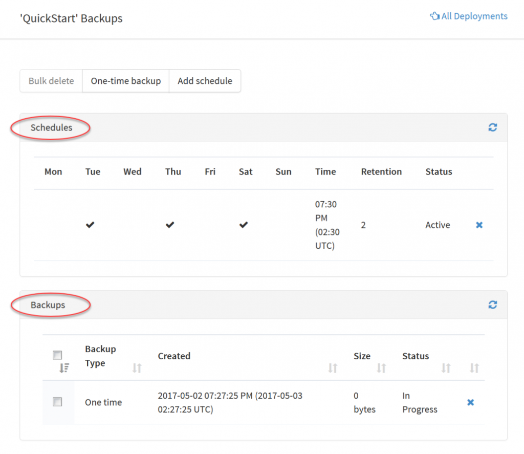 Backups of a deployment can be performed on demand or automatically on a configurable schedule. Backups include both the Solr index and the Zookeeper configuration.