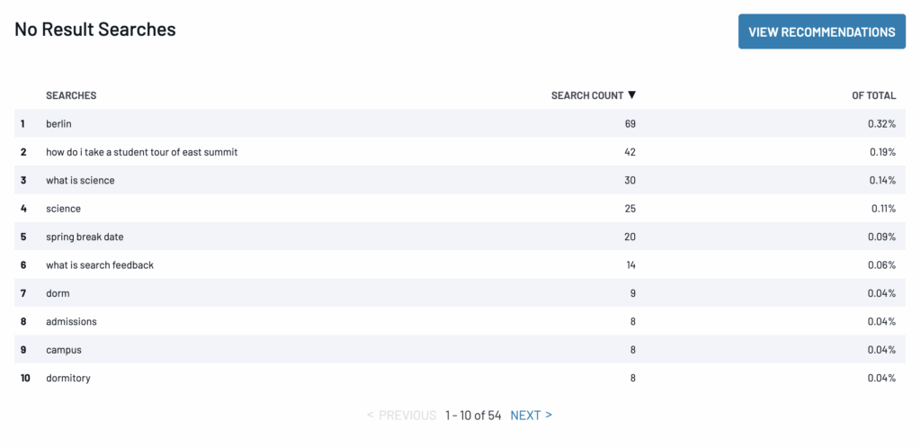 The No Result Searches feature lists exactly which search queries your audience is issuing and will help you discover where your content strategy could better serve their needs.