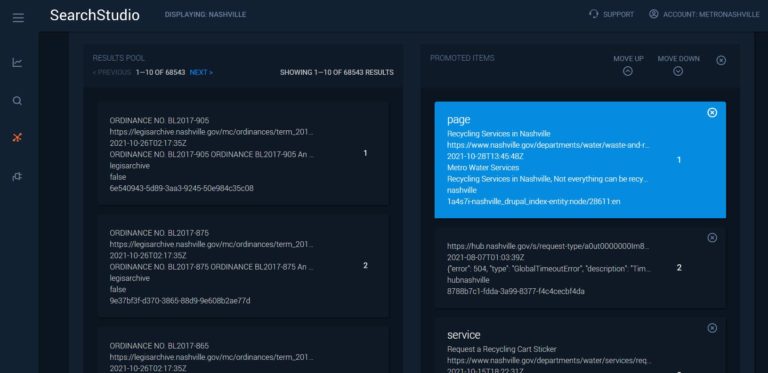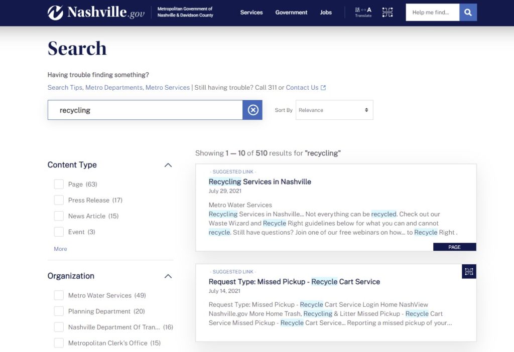For example, using the Promotions feature in Site Search, the Nashville team created a promotion for Recycling Services. When any of four search terms (trash, recycling, missed pickup or recycle bin) are entered into the search window, the search results will include four suggested links that will most likely answer the user’s question.
