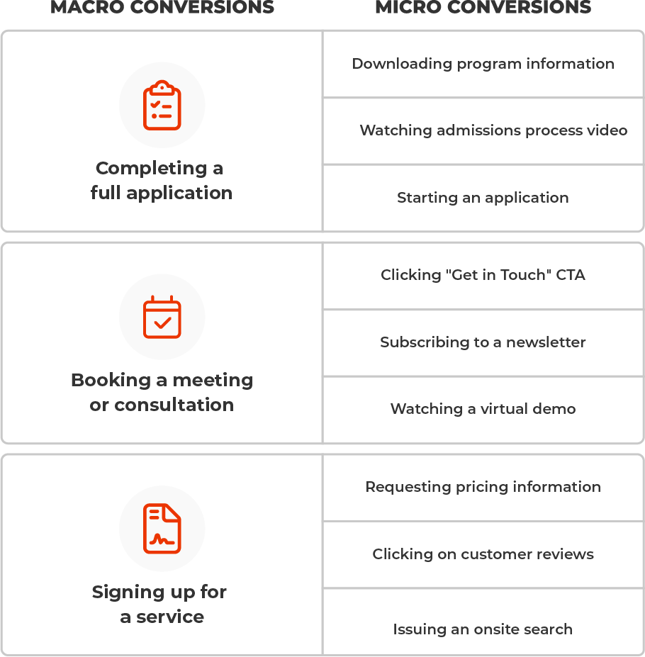 - Macro conversions: Completing a full application, booking a consultation or signing up for a service