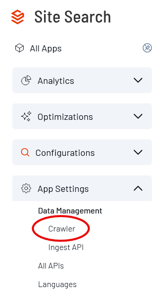 If the Crawler feature is enabled for your Enterprise account, you’ll find it listed under Site Search > App Settings > Data Management > Crawler in the Navigation Menu:
