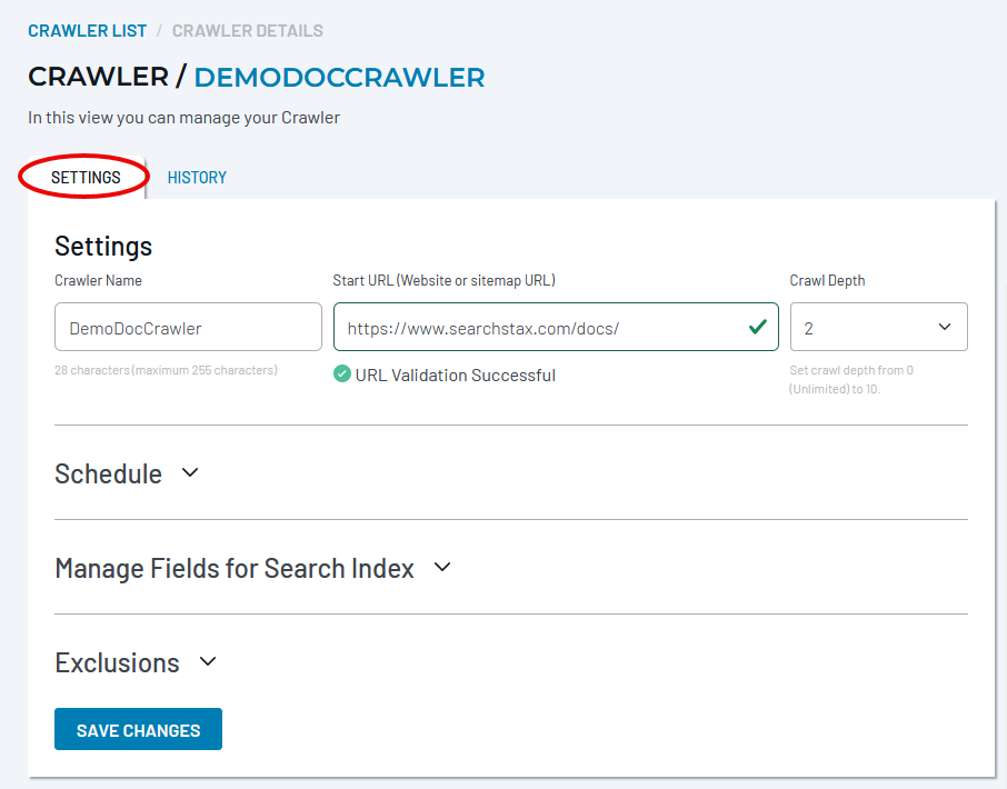 Clicking on a crawler in the Crawler List takes you to the Crawler Details screen. Select the Settings tab.