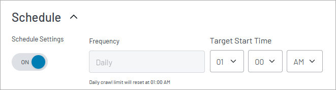 When enabled, the crawler repeats its crawl daily at the indicated local time. Subsequent crawls add newly found pages, delete pages that can no longer be found, and refresh the remainder.