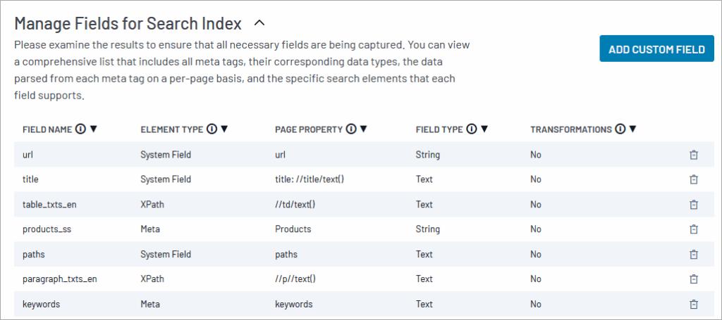 The crawler maps information about a web page to Solr schema fields in the Site Search index. Although the crawler has a default set of mappings, some customization is normal. The Fields table lets you edit and refine your field mappings.