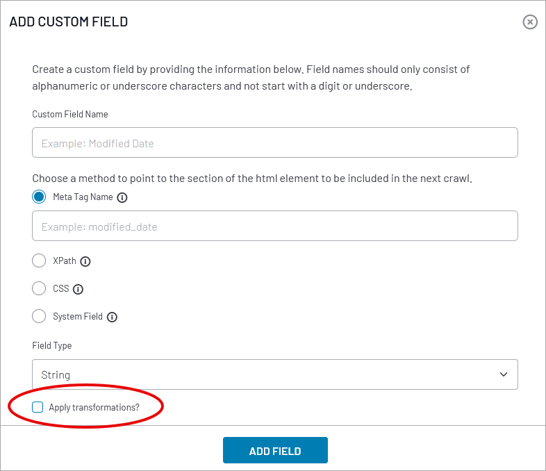 The Apply Transformations feature becomes available when defining string and text fields. This makes transformers available to normalize irregular field values during ingestion. See Crawler Transformers in the Help Center.