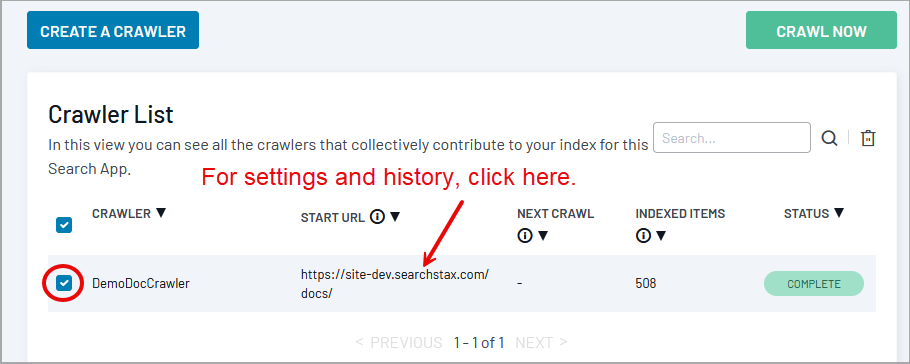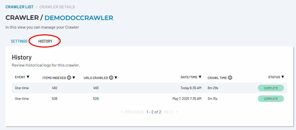 To view a crawler’s details, settings, and history, click the desired crawler in the list.