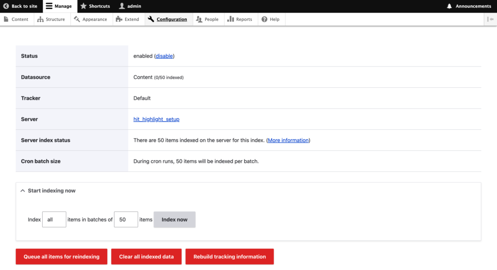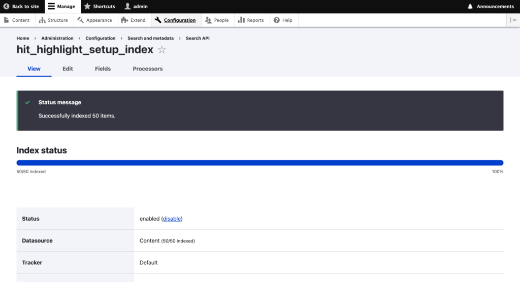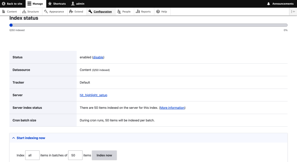 Once the indexing process is successful, the Index status progress bar at the top should be completely filled, stating the number of items that were indexed.
