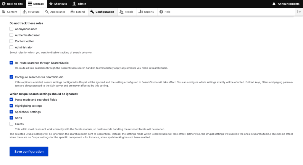 After it’s done, your Searchstax settings page on the Drupal Admin dashboard under Configuration > Search and metadata > SearchStax settings should look somewhat like this: