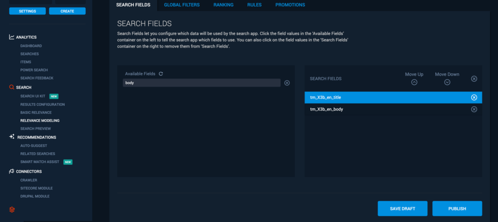 Remember to add all the relevant fields (Title and Body in this example) in both places, i.e., Results Configuration and Relevance Modeling. These additions are essential for the hit-highlighting feature to work correctly. |