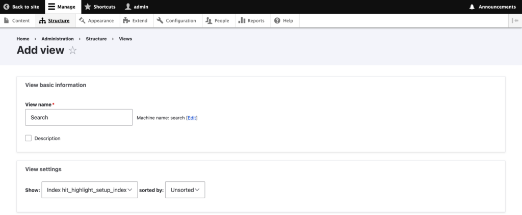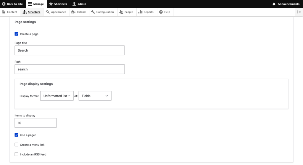 Create a Search page on Drupal by going to Structure > Views > + Add View, and selecting the Index [your_index] option from the Show dropdown menu under View settings.