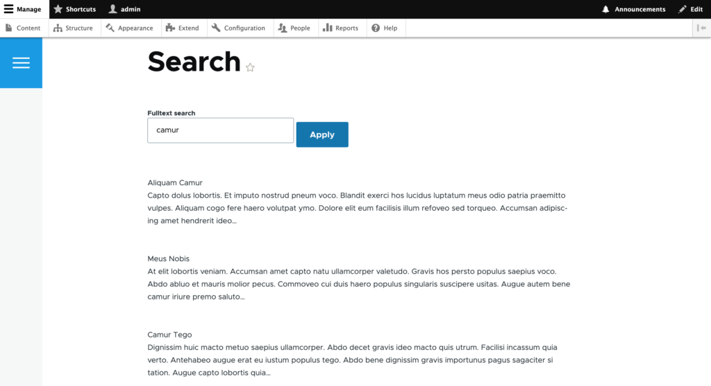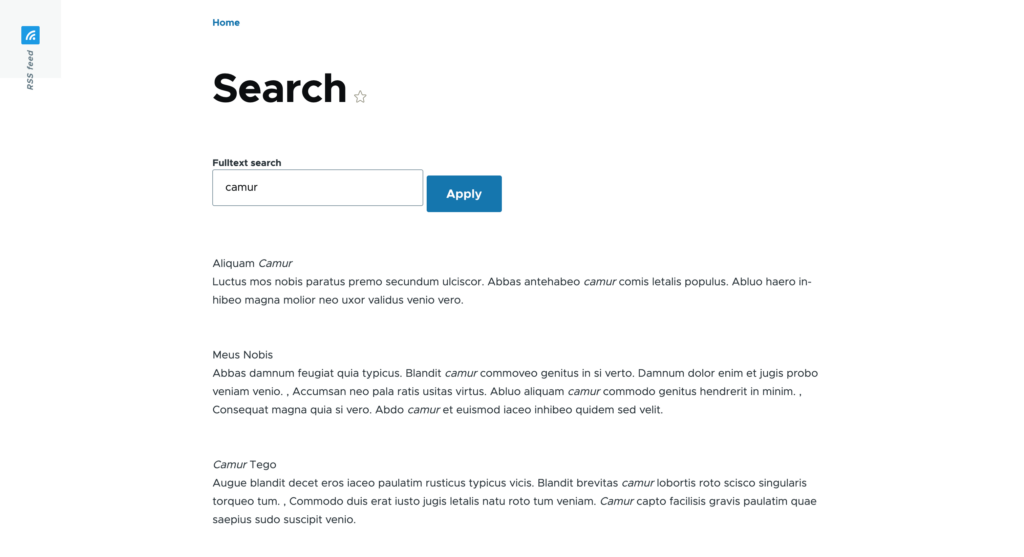 Once the Site Search changes are published, go back to your Drupal Search page and search for something. The matched terms in the search results should be highlighted now, appearing italicized.