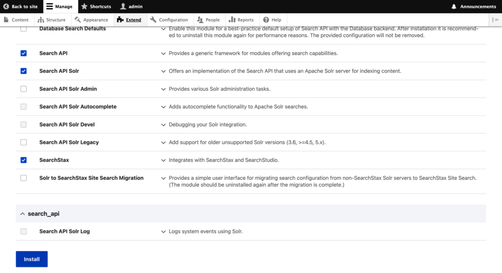 - Search API Solr (install command available at https://www.drupal.org/project/search_api_solr)