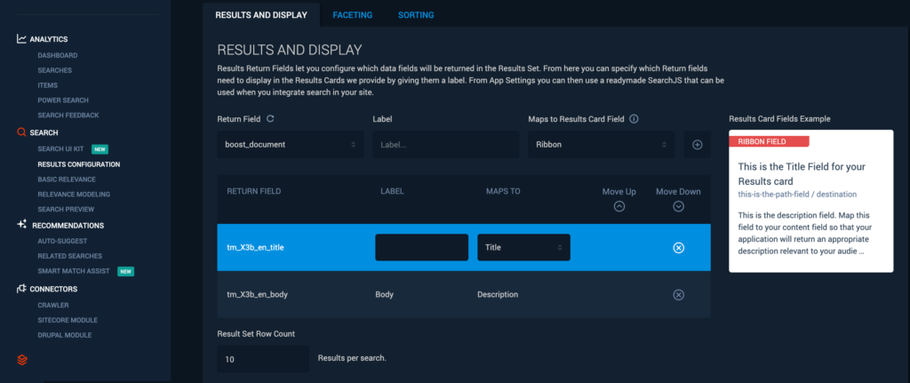 Then, using the dropdown just below Return Field, add the corresponding entries for the fields added on Drupal (identified by their machine names) under the Results Configuration > Results and Display section.