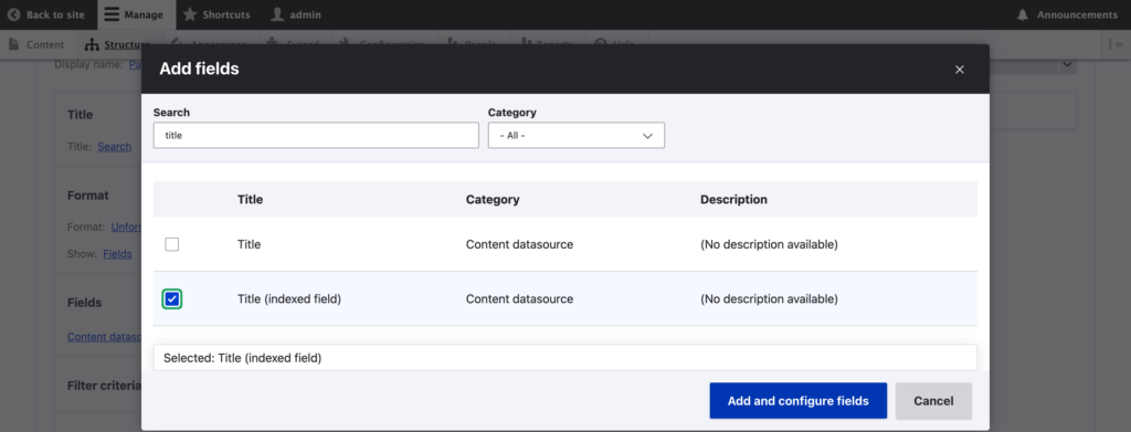 In the Search page Edit view, under the Fields section, add the Title (Indexed field) and Body (Indexed field) fields to be included in the search results. Then, click on Add and configure fields.