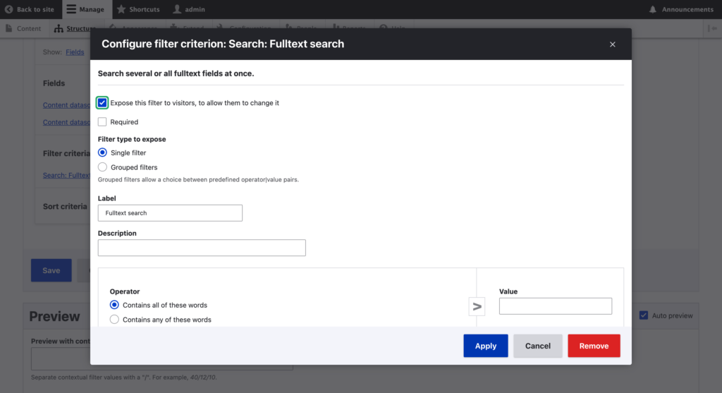After clicking on Add and configure filter criteria, expose the newly created filter so that you are able to perform searches. Again, hit Apply and then Save for the changes to take effect.