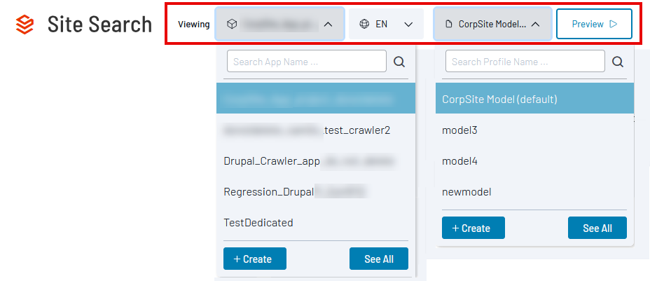 - Viewing [Search App]: Choose the Site Search App to edit, or the +Create button to create a new one. The See All button opens a detailed table of all available Apps.