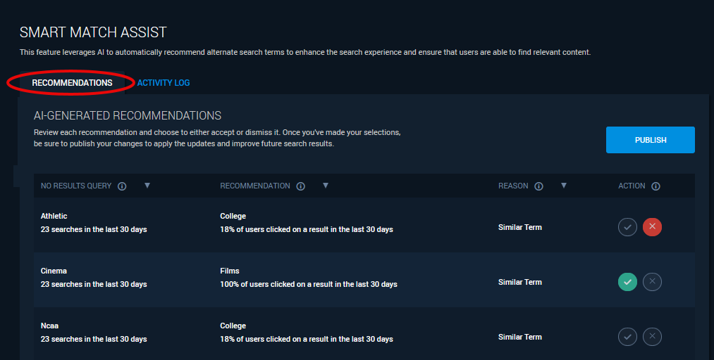 When a suggestion is accepted or dismissed by the Site Search user, it disappears from the Recommendations list and appears on the Activity Log.