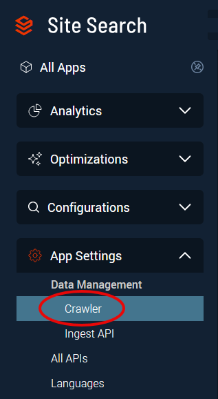 If the crawler feature is enabled for your account, you’ll find it listed under Site Search > App Settings > Data Management > Crawler in the Search App’s navigation menu: