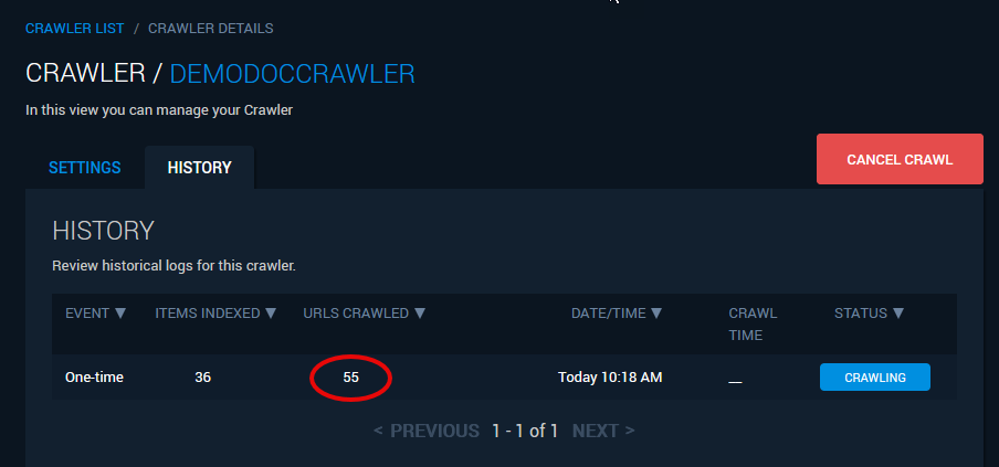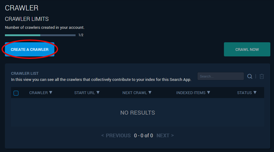 A Search App can have multiple crawlers, depending on the terms of your contract. Each crawler can index a different website. The list is initially empty. Click Create a Crawler.