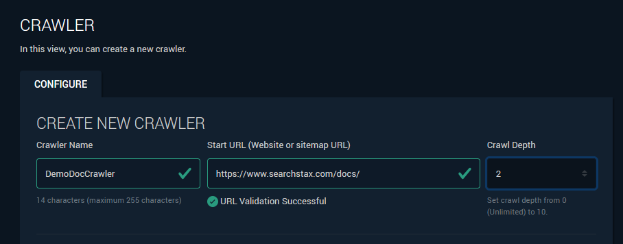 The next step is to provide your crawler with a name and a starting URL. Site Search will verify that the URL is reachable.