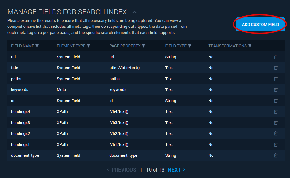 Open the Manage Fields for Search Index section of the crawler settings. You’ll see the list of default fields.