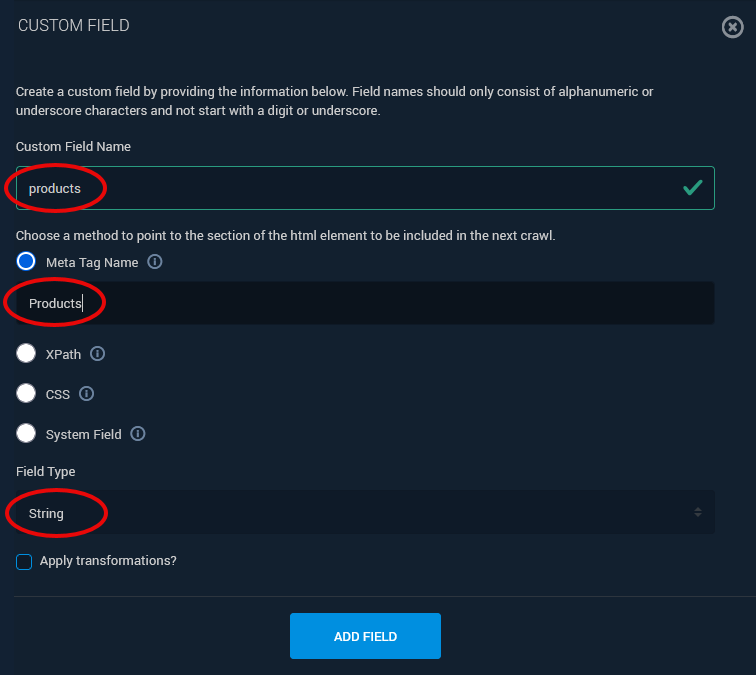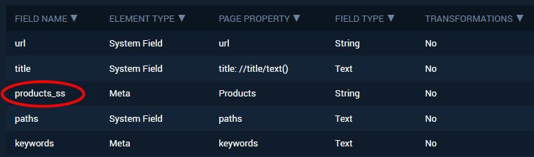 Click Add Field. The new field, labeled products_ss (your field name plus the string datatype), will appear in the list.
