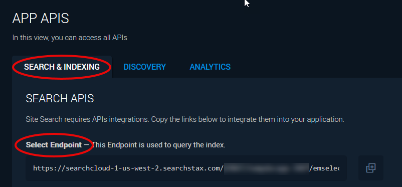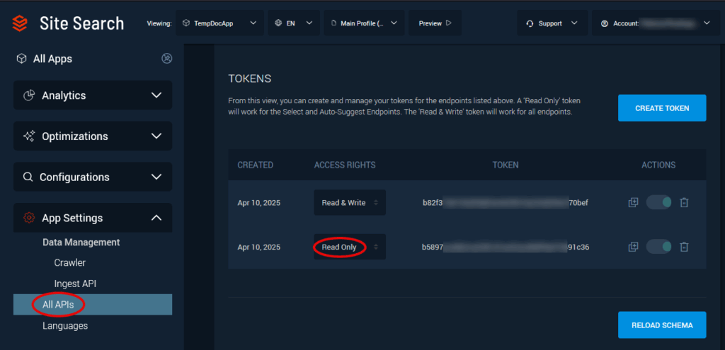 Navigate to the Site Search > APP Settings > All APIs > Search & Indexing screen. The Read-Only authentication token is near the bottom of the screen.