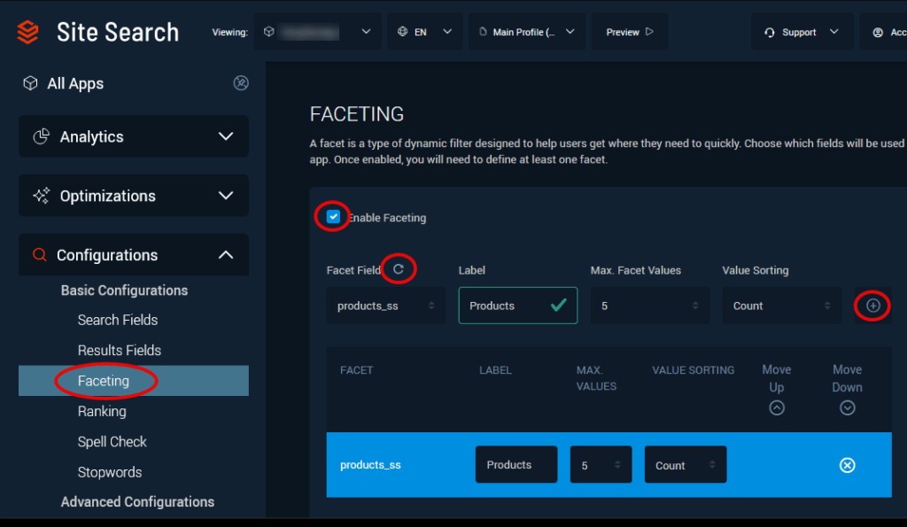 Navigate to Site Search > Configurations > Basic Configurations > Faceting.