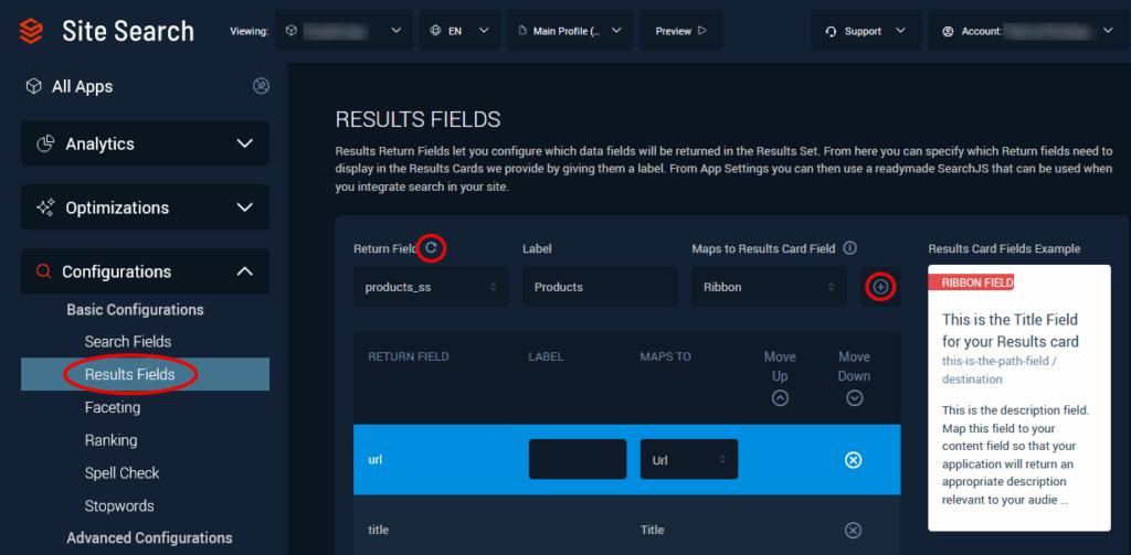 Choose a field from the Return Field list. If needed, add a human-friendly Label. Then, map the field value to a Results Card Field, as explained on the Results Configuration page. The (+) icon at the right adds the configured field to the list of display fields (the lower red box). Don’t overlook that step!
