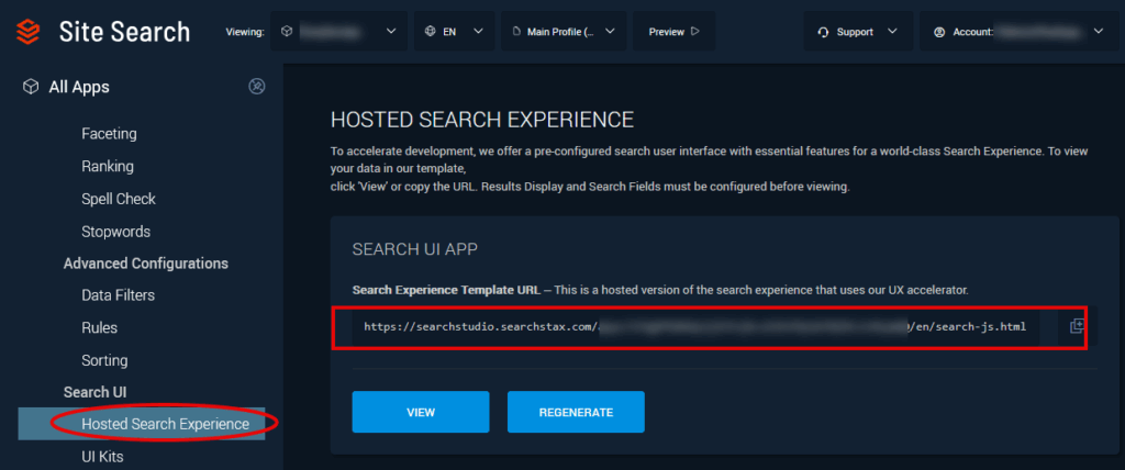 In the navigation menu, navigate to Site Search > Configurations > Search UI > Hosted Search Experience.